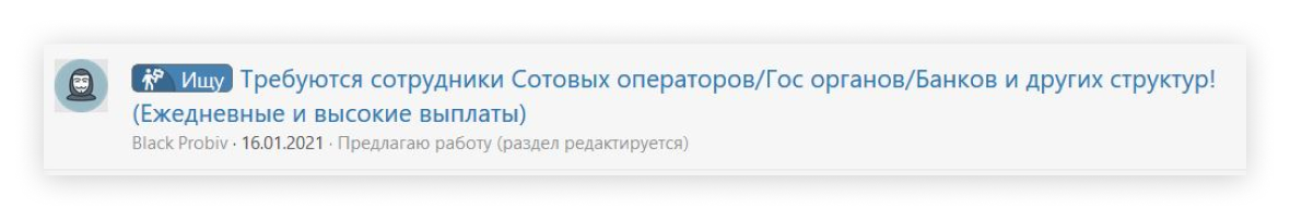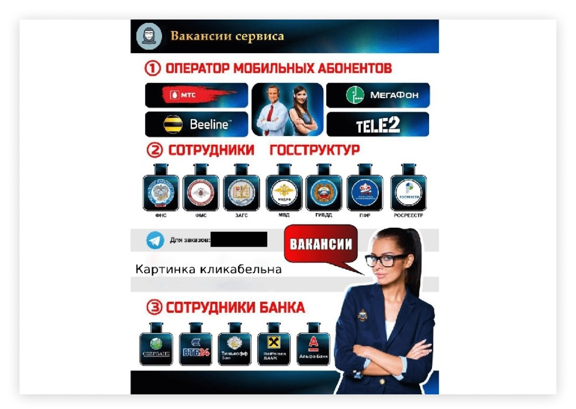 - Сотрудники силовых ведомств, которые раньше поставляли данные, «залегли на дно», рассказали The Bell несколько человек, работающих на рынке. Поэтому у сервисов, торгующих данными, возникла нехватка информации. На площадках стали появляться объявления о поиске источников в офисах сотовых операторов (геолокация, СМС, звонки), в ФНС (налоговая отчетность), МВД (судимости), ГИБДД (транспорт и штрафы), ЗАГС (родственные связи), Росреестре (недвижимость) и других госструктурах. «Выхлоп» от таких объявлений — минимальный, поскольку «все смелые уже занимались этим, а несмелые сейчас испуганы еще сильнее», — рассказывает один из собеседников.