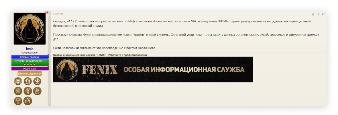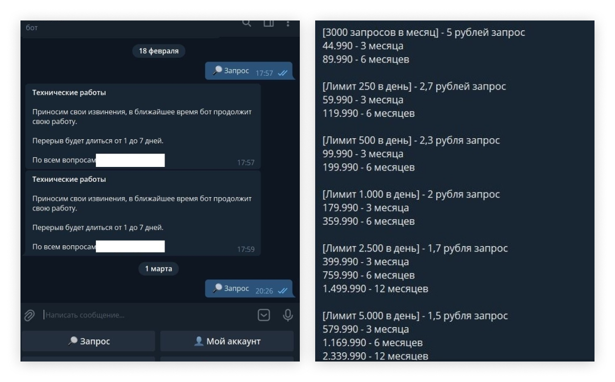 - Погиб крупный проект для «пробива» в Telegram, запущенный незадолго до выхода расследования в середине декабря. Несколько недель сервис продавал оптовые подписки за миллионы рублей, при которых каждый запрос обходился бы в 1,5–5 рублей вместо примерно 200 рублей разово (по данным The Bell, реальные покупатели были), но к марту «лег» окончательно. По словам одного из собеседников The Bell на рынке «пробива», «кидать никого не планировалось», а прекращение работы связано только с массовыми проверками силовиков на предмет торговли данными. Курируют их сотрудники центрального и региональных аппаратов ФСБ.