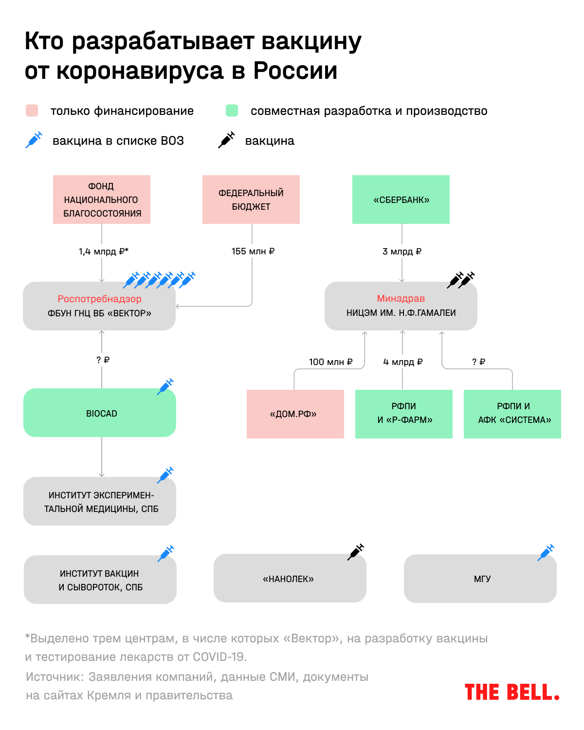 Госфинансирование — не единственный источник средств для разработчиков вакцин. По грубым подсчетам The Bell, с учетом спонсорских денег на создание вакцины от коронавируса в России могут потратить около 10 млрд рублей. Из них 1,5 млрд — это бюджетные деньги, остальное — инвестиции частных партнеров.