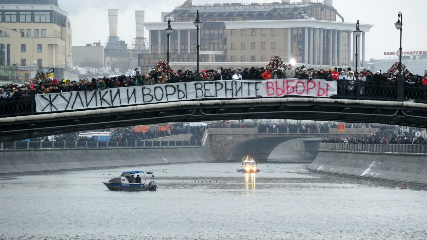 Протест «белоленточной» оппозиции против массовых фальсификаций на выборах в Госдуму. Болотная площадь в центре Москвы, 10 декабря 2011 года. Лозунг «Единая Россия» — партия жуликов и воров» был введен в оборот именно Навальным.