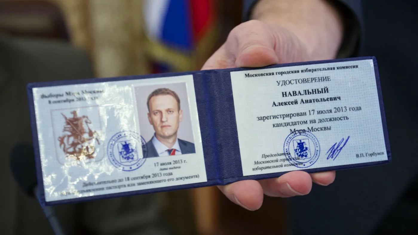 Глава избирательной комиссии показывает свидетельство Алексея Навального о выдвижении кандидатуры на пост мэра Москвы в московской избирательной комиссии в Москве, 17 июля 2013 года. На выборах Навальный покажет второй результат — 27% — после Сергея Собянина.