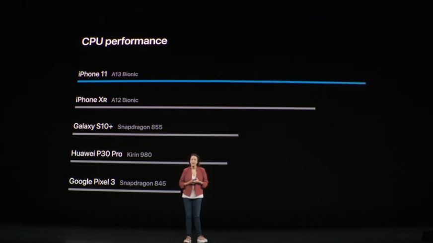 Здесь у Apple неожиданная ступенька в презентации — они рассказывают об устройстве уже заявленного процессора A13 Bionic, говоря о низком энергопотреблении и модуле для машинного обучения.
