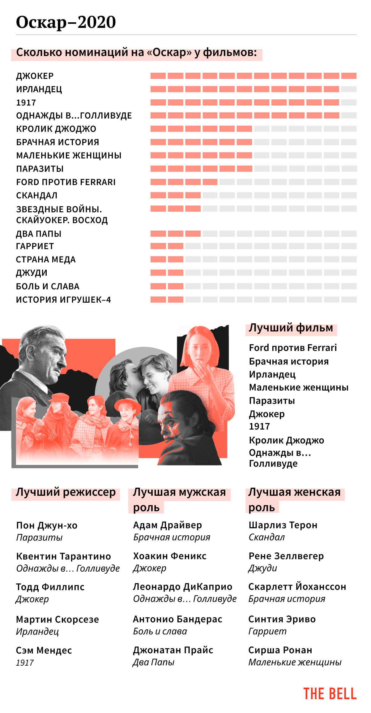 Еще одна интрига — получат ли свои награды фильмы Netflix (в шорт-лист «Оскара» попали сразу 7 фильмов студии — это больше, чем у других компаний). По данным WSJ, Netflix потратил около $100 млн на раскрутку своих оскаровских фильмов, большая часть бюджета ушла на «Ирландца». Но это не значит, что победа уже в кармане: на «Золотом глобусе» Netflix уже потерпел неудачу, заполучив, вопреки всем прогнозам, только одну награду.