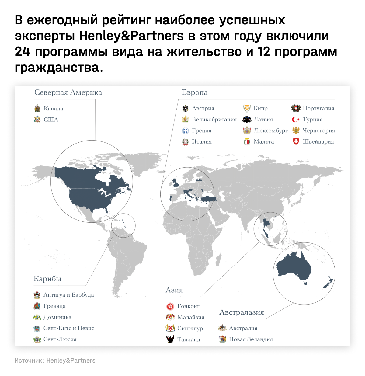 Консалтинговая компания Henley & Partners ежегодно публикует два рейтинга — программ вида на жительство (ВНЖ) через инвестиции и программ гражданства через инвестиции.