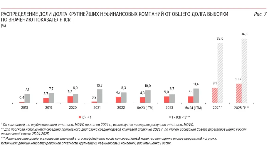 Для оценки ситуации с покрытием процентных расходов компаний ЦБ использует показатель ICR, который равен отношению EBITDA к процентным расходам. Если ICR менее 1, это значит, что компания не может полноценно обслуживать свои обязательства. При значении коэффициента от 1 до 3 компания имеет повышенную процентную нагрузку — и при росте процентных расходов или снижении операционных результатов она может начать испытывать сложности с обслуживанием долга.