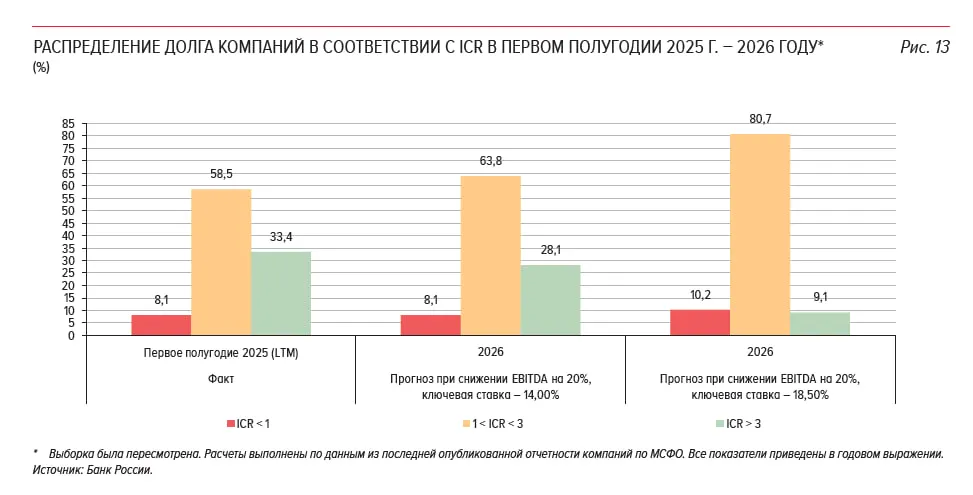 Прогноз ЦБ на следующий год выглядит мрачно. В 2026 году доля долга, который придется на компании с ICR от 1 до 3, вырастет до 80,7% при снижении их EBITDA на 20% и при среднем уровне ключевой ставки до 18,5%. И даже если средний диапазон ключевой ставки будет 14%, доля проблемного долга в российском бизнесе вырастет в следующем году до 63,8%.