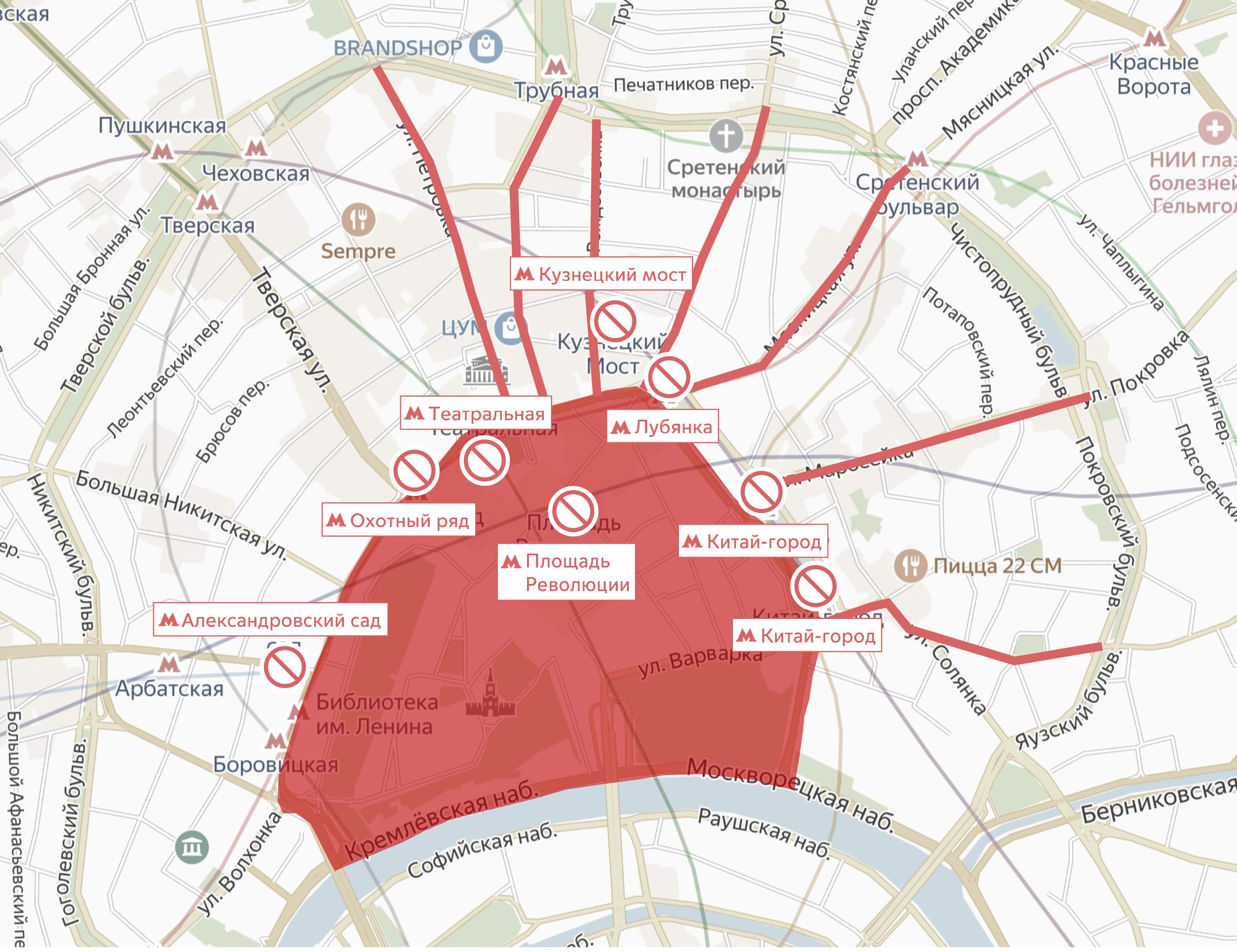 Помимо улиц, полиция закроет станции метро «Александровский сад», «Охотный ряд», «Театральная», «Площадь Революции», «Кузнецкий мост», «Лубянка» и «Китай-город». Станции будут закрыты на вход и выход с 8.00.