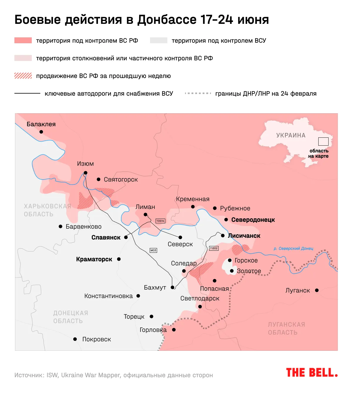 В трехмесячных позиционных боях вокруг Северодонецко-Лисичанского выступа наступил локальный перелом: российское Минобороны объявило о разгроме украинских войск в «котле» к югу от Лисичанска и блокировании самого города. Украинские официальные лица заявили, что украинскую группировку удалось вывести из «котла» до его закрытия — но при этом признали, что начали отвод войск из административной столицы Луганской области, Северодонецка, бои в котором шли почти месяц. С потерей столицы украинской части Луганской области и вероятным взятием Лисичанска ВС России установят контроль над всей территорией области.