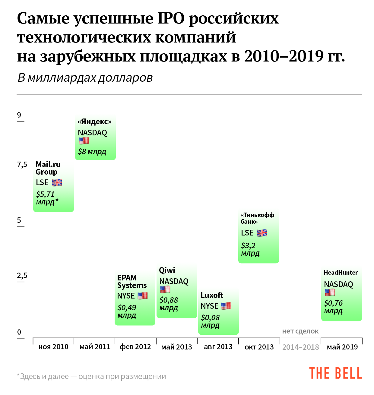 Первые годы десятилетия — время триумфальных IPO российских технологических компаний на главных зарубежных площадках. В 2010–2013 годах друг за другом на биржу вышли Mail.Ru Group, «Яндекс», Qiwi, Luxoft, «Тинькофф банк» и другие. Но потом была долгая пауза, которую лишь в 2019 году прервал HeadHunter.