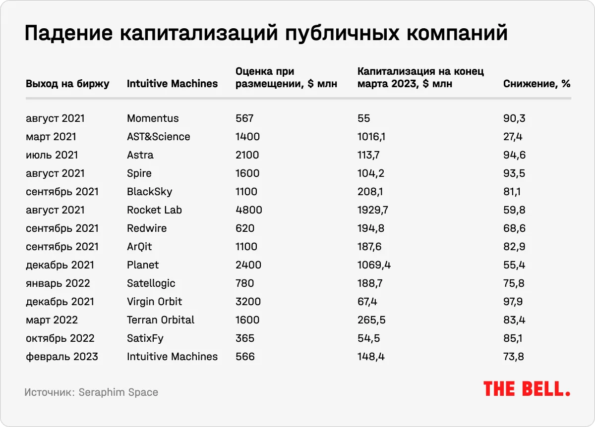 Но бум быстро закончился. Сейчас капитализация всех космических компаний, разместившихся на бирже через SPAC, не просто ниже оценки, полученной при IPO, — их акции обесценились на десятки процентов. Некоторые компании (Momentus, Astra Space) находятся на грани делистинга, поскольку их акции уже стоят ниже $1 за штуку — ниже порога американских биржевых площадок. А 4 апреля еще одно детище Ричарда Брэнсона Virgin Orbit объявила о банкротстве, за несколько дней до этого сообщив об увольнении 85% персонала.
