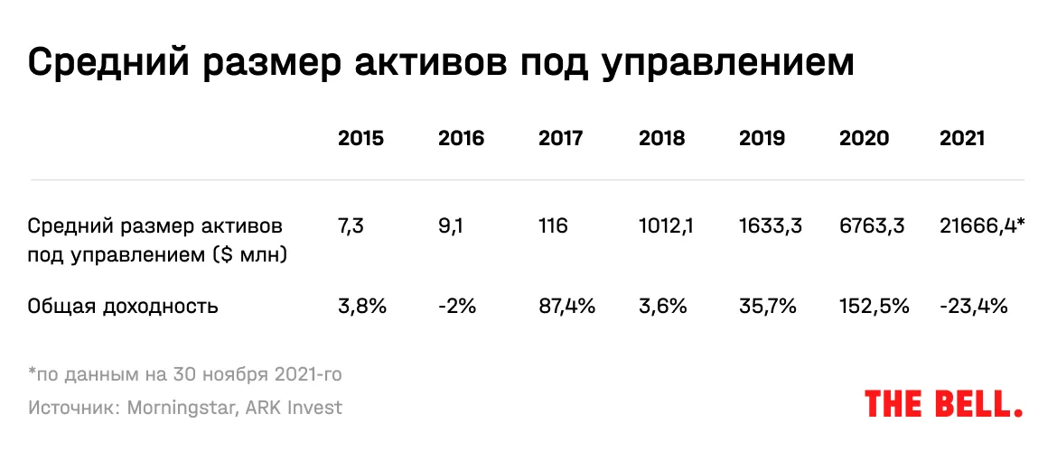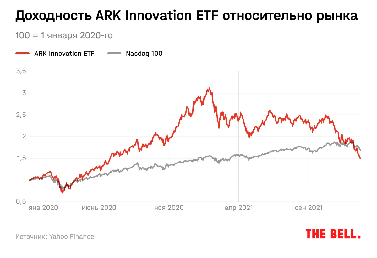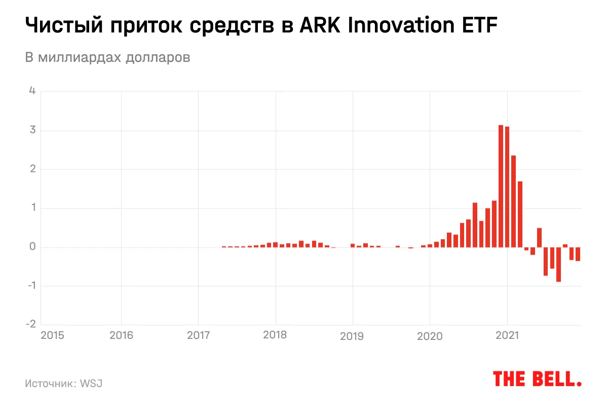 Взрывной рост внимания инвесторов к фонду начался только во второй половине 2020 года. С января 2020 по ноябрь 2021 года включительно фонд ARK Innovation, по расчетам Morningstar, получил 90% всех денег, которые были у него под управлением в конце прошлого года.