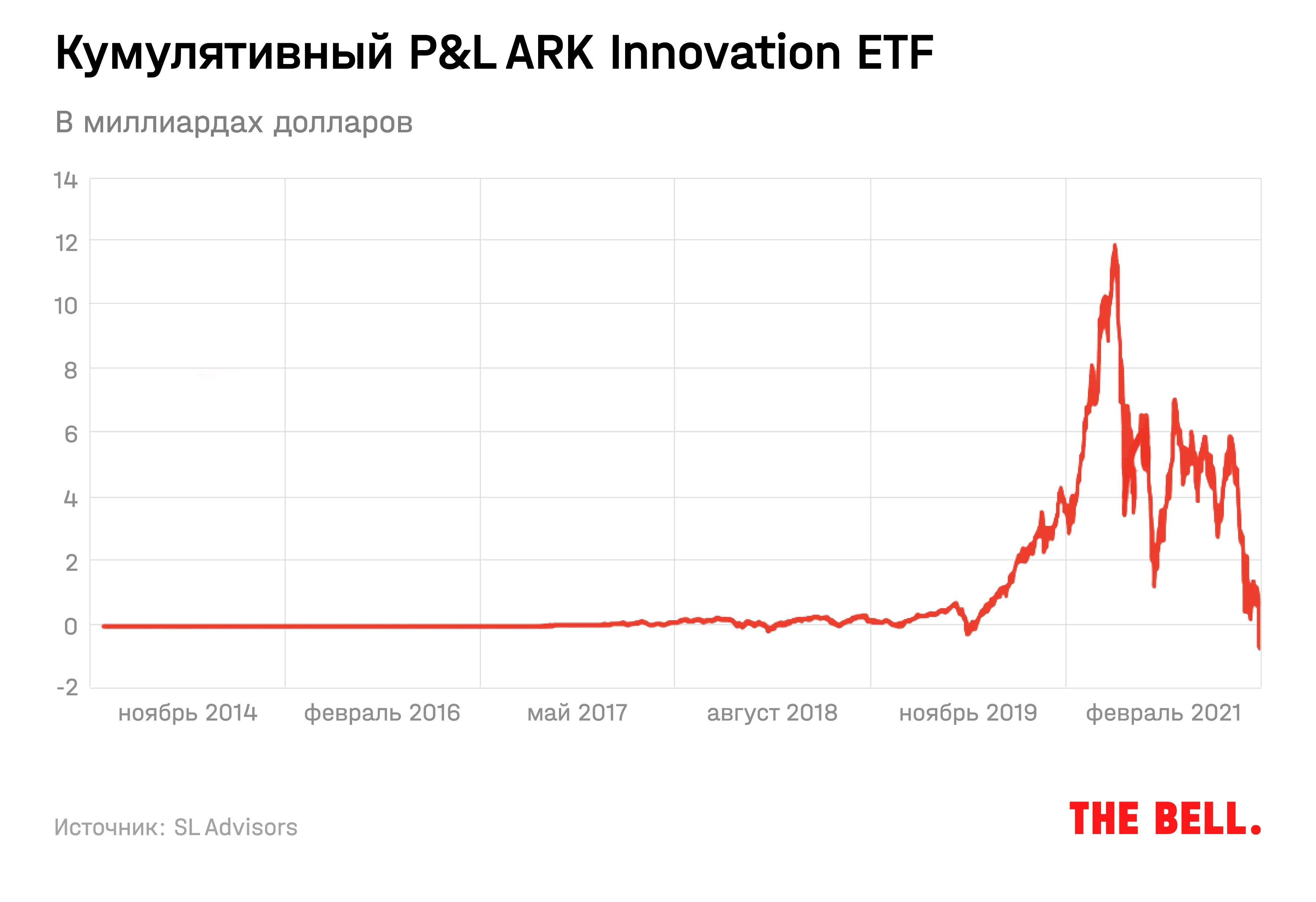Кумулятивный P&L рассчитывается с учетом того, когда инвесторы вложили деньги или вывели средства из фонда. В первые годы существования ARK Innovation приток средств был минимальный: в 2015–2016 годах средний размер активов фонда составлял $7,3 млн и $9,1 млн соответственно, подсчитали в Morningstar. К концу 2016 года фонд имел активы всего лишь на $12 млн, так что высокую доходность 2017 года застали немногие инвесторы.