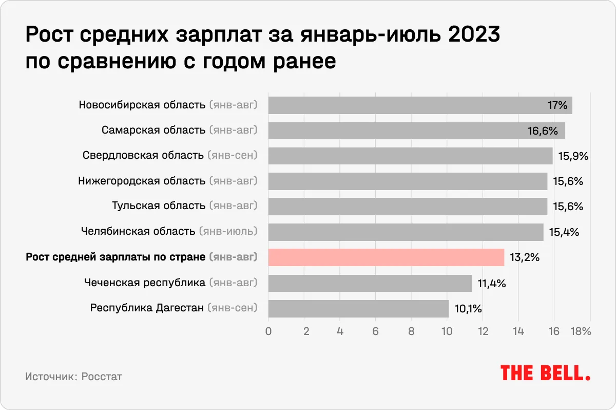 Рост зарплат — прямое последствие попытки предприятий удержать рабочую силу в условиях ее дефицита. Некоторым предприятиям даже пришлось несколько раз индексировать зарплаты в течение 2023 года, говорилось в недавнем докладе ЦБ «Региональная экономика».