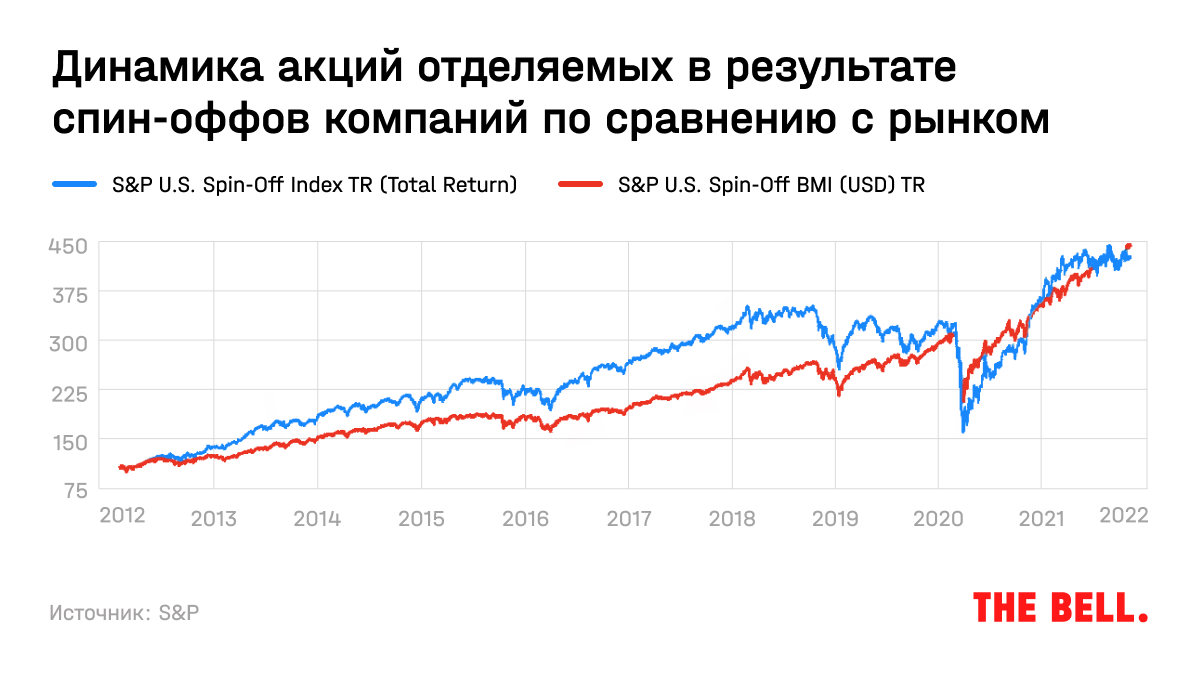 Спин-офф, как правило, хорошо воспринимаются инвесторами. Несколько исследований, проведенных между 1990-м и серединой 2010-х годов, показали, что отделяемые компании в среднем могут опережать рынок на 10–15 п. п. в течение года после выхода на биржу, пишет WSJ. Данные S&P за 1989–2015 годы показывают, что акции отделяемой компании опережают отраслевой индекс на горизонте одного и трех лет. Об этом же говорят эксперты, опрошенные CNBC.