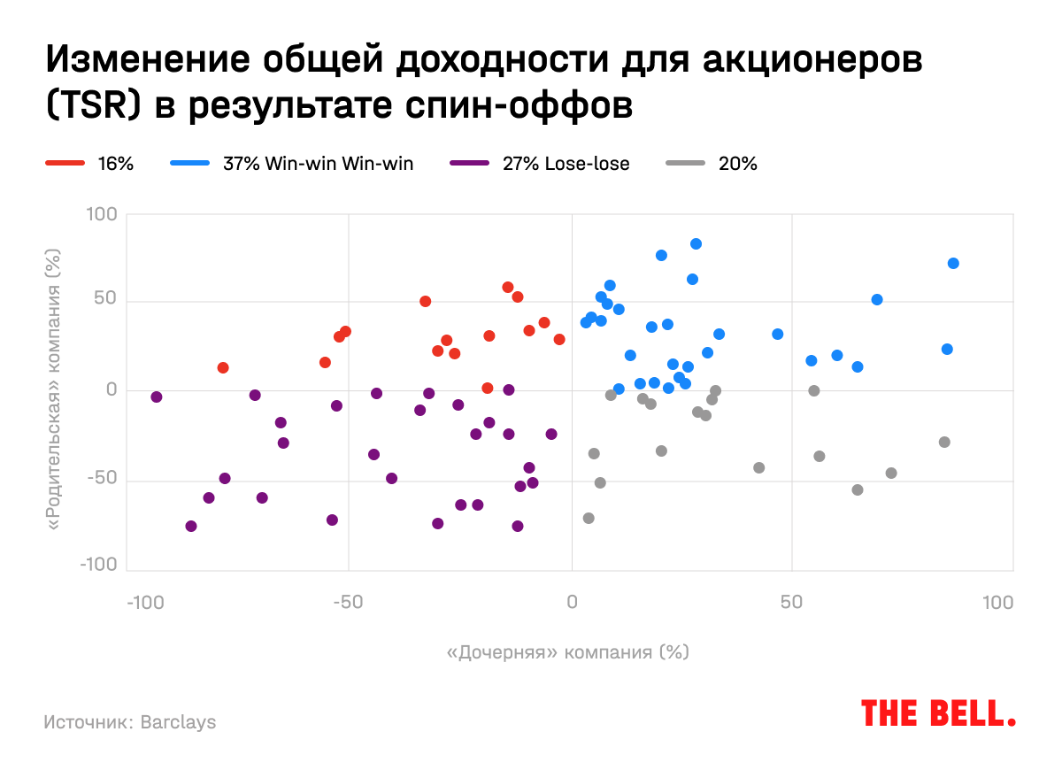 Частично это можно было бы объяснить тем, что инвесторы не пересмотрели мультипликаторы после разделения, однако данные Barclays по более чем 100 сделкам спин-офф в 2001–2018 годах показывают, что довольно часто они заканчиваются неудачами: 27% разделений привели к снижению общей доходности для акционеров (Total Shareholder Returns) обеих компаний.