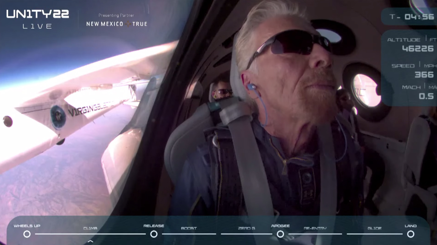 Космический корабль VSS Unity компании Virgin Galactic Ричарда Брэнсона успешно стартовал из Нью-Мексико и начал первый полет в космос с туристами. На борту ракетоплана два пилота и четыре пассажира. Среди них сам основатель Ричард Брэнсон. Сегодня он стал первопроходцем космического туризма, воплотив давнюю мечту и обогнав главного конкурента Джеффа Безоса. Трансляция исторического события ведется в прямом эфире на официальном сайте Virgin Galactic.