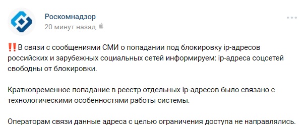 - Утром Роскомнадзор выпустил пост во ВКонтакте. В нем он объяснил ночные события «технологическими особенностями работы системы». «Операторам связи данные адреса с целью ограничения доступа не направлялись», - заявила служба.