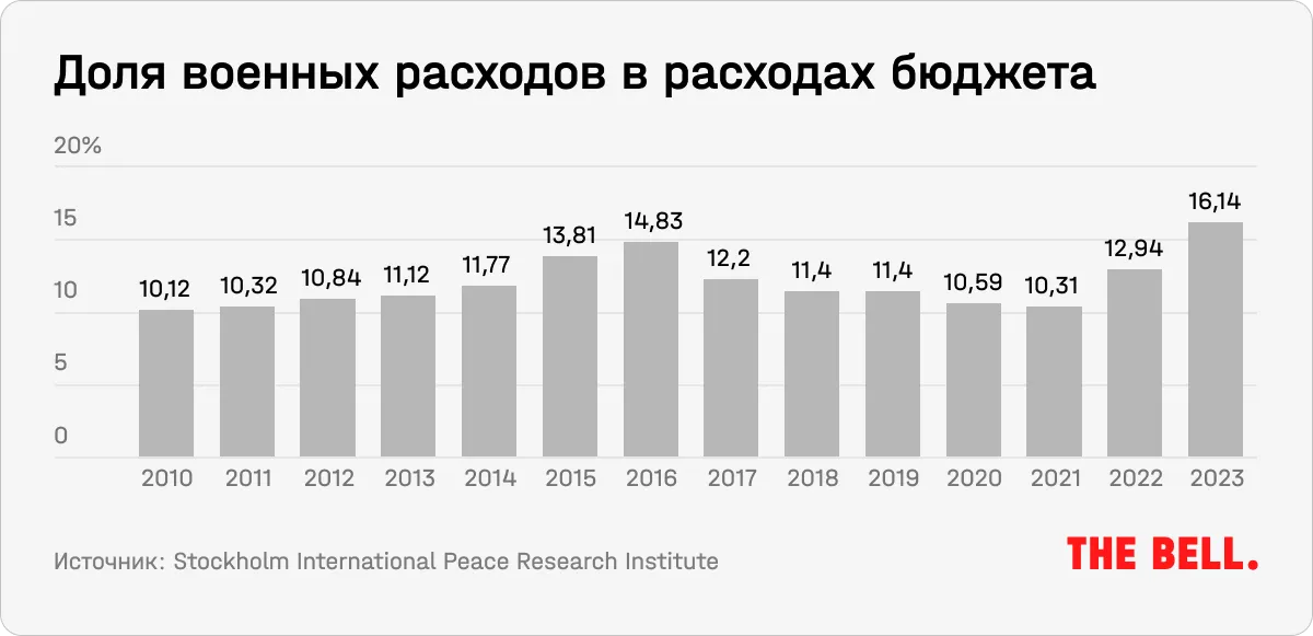 - Мировые военные расходы растут рекордными темпами. По оценкам Стокгольмского международного института исследований проблем мира (SIPRI), в 2023 году военные расходы в мире выросли на 6,8% и достигли рекордного показателя $2,443 трлн — 2,3% мирового ВВП. Военные расходы России в 2023 году выросли на 24%, до $109 млрд. Совокупные военные расходы стран-членов НАТО в том же году достигли $1,341 трлн — 55% от мировых расходов. Из 32 стран НАТО, включая двух новых членов, Финляндию и Швецию, 23 страны выполнили обязательство тратить на оборону не меньше 2%, следует из отчета альянса. Это самое большое число членов НАТО, выполняющих или превышающих этот порог, с момента его введения в 2014 году. В логике Владимира Путина это означает, что враг вооружается — а значит, сокращение военных трат в этом контексте выглядит маловероятным.