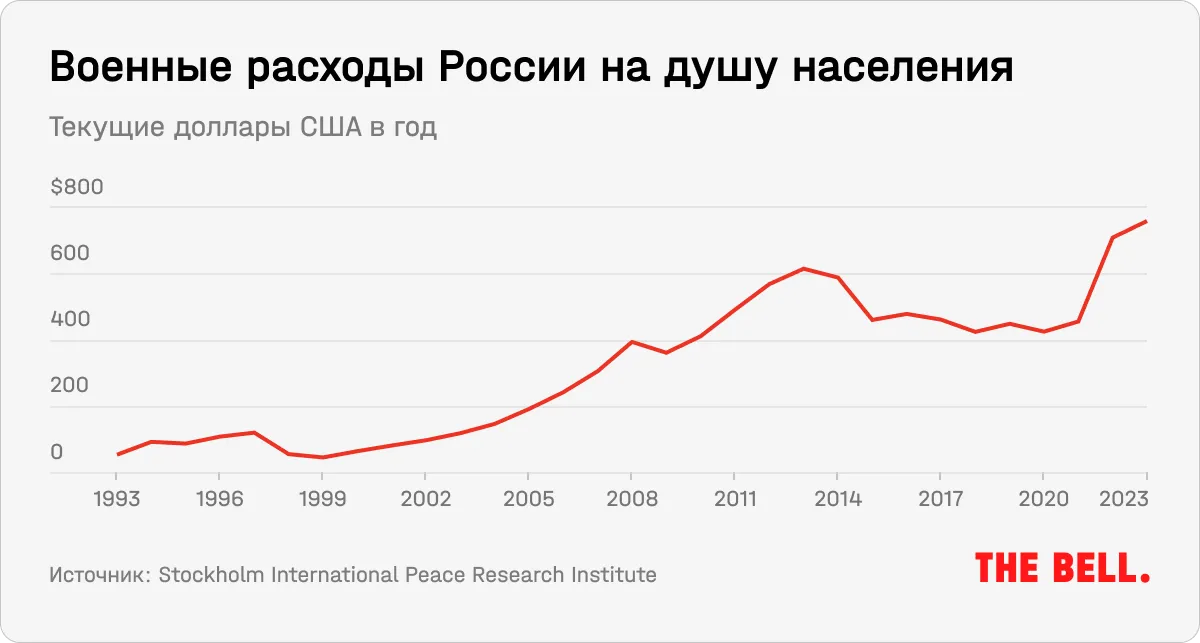 - Война с Украиной продолжается. Киев получил, пусть и с задержкой, $60 млрд американской помощи, существенная часть из которой — вооружения. О планах передать Украине вооружения объявили страны Европы. Ни эксперты, ни полисимейкеры не ожидают завершения войны (по крайней мере ее горячей фазы) в 2024 году. У Кремля нет причин сворачивать ее финансирование. Скорее наоборот, высок соблазн его нарастить, поскольку западная помощь поступает с задержками, а Путина в этом смысле ничто не ограничивает. Мобилизация вызывает у населения негативную реакцию, поэтому ставка сделана на контрактную армию. Минобороны набирает в месяц около 30 тысяч контрактников, и их вознаграждение растет: если в начале войны речь шла о 200 тысячах рублей в месяц, то сейчас выплаты могут превышать 400 тысяч. Более того, региональные власти наперегонки повышают собственные доплаты, помогающие им выполнить план по набору. Власти Санкт-Петербурга уже обещают за подписание контракта с Минобороны разовый бонус 1,3 млн рублей. «Траты Минобороны на денежное довольствие военнослужащих, которые внутри военных расходов оценивались примерно в 1,5 трлн рублей, сейчас, скорее всего, приблизились к 2 трлн», — подсчитал для The Bell федеральный чиновник.