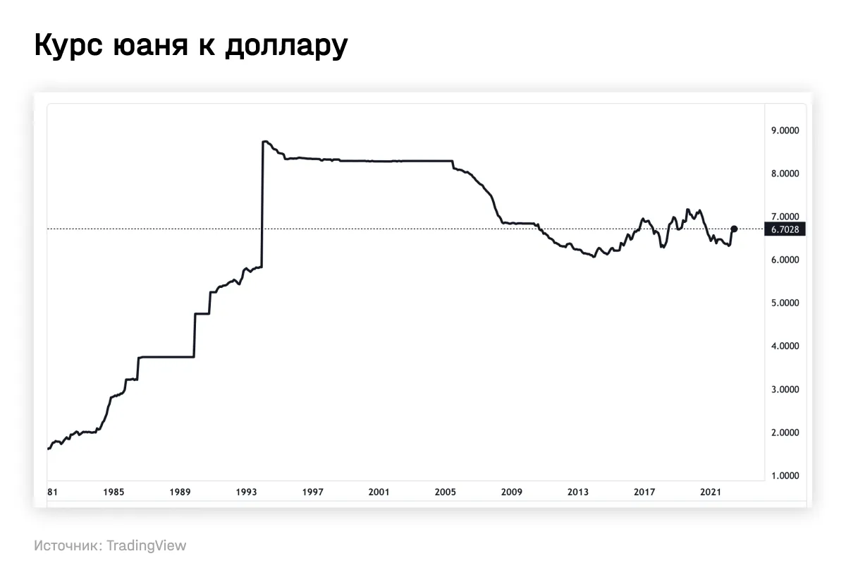 В 1980-е годы Китай повторял путь других «азиатских тигров»: по мере открытия экономики для стимулирования экспорта позволял юаню девальвироваться. Позже, с середины 1990-х годов до июля 2005-го, курс юаня к доллару США был зафиксирован на уровне 8,28 за доллар. Впоследствии Национальный банк Китая (НБК) перешел к политике плавающего, но управляемого курса юаня, что привело к постепенному укреплению курса.