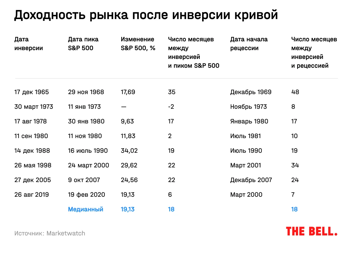 Начиная с 1955 года каждой рецессии в США с лагом от 6 до 24 месяцев предшествовала инверсия кривой доходности между долгосрочными (10-летними) и краткосрочными (1-летними) трежерис, говорится в исследовании Федерального резервного банка (ФРБ) Сан-Франциско. Единственный «ложный сигнал» был в 1998 году.