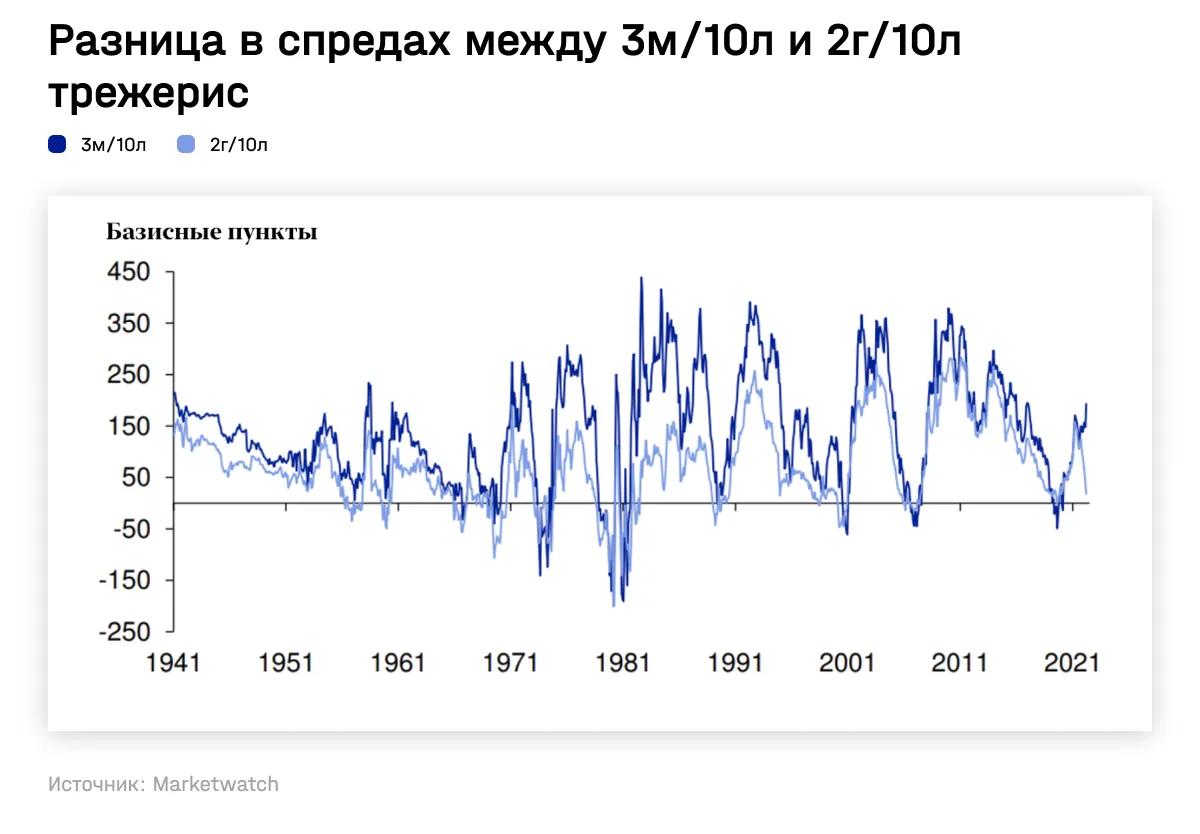 В прошлый вторник, впервые с августа 2019 года, доходности двухлетних американских казначейских облигаций (трежерис) превысили доходности десятилетних. Это знаковое событие: инверсия кривой доходности, то есть превышение краткосрочных ставок над долгосрочными, именно по этим бумагам считается самым надежным опережающим индикатором возможного наступления рецессии в американской экономике, отмечает редактор Bloomberg Джон Отерс.