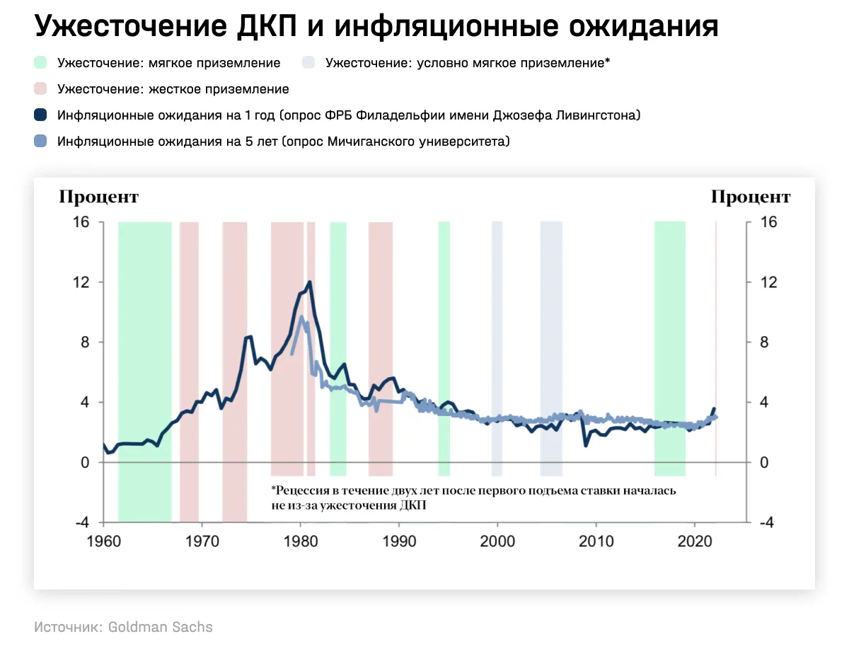 3. «Жесткие приземления» 1970–1980-х годов были также связаны с ростом долгосрочных инфляционных ожиданий до высоких уровней, в то время как вероятность «мягкого приземления» увеличивалась во времена, когда ожидания были заякорены. Несмотря на то что в последние два года долгосрочные инфляционные ожидания выросли, они еще не достигли тех уровней, которые требуют жесткой ДКП сами по себе.