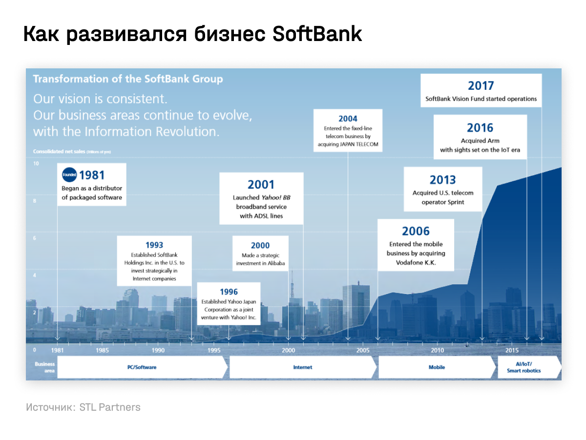 Что с портфелем SoftBank происходило после этого, хорошо описал [бывший издатель The Bell] Александр Амзин в статье «Залить деньгами и проиграть: уроки поражений главного техноинвестора мира». SoftBank начал делать очень агрессивные инвестиции, зачастую убеждая основателей компаний взять у него большие деньги, как он сделал с Yahoo!, которая искала $5 млн, а получила в итоге $100 млн.