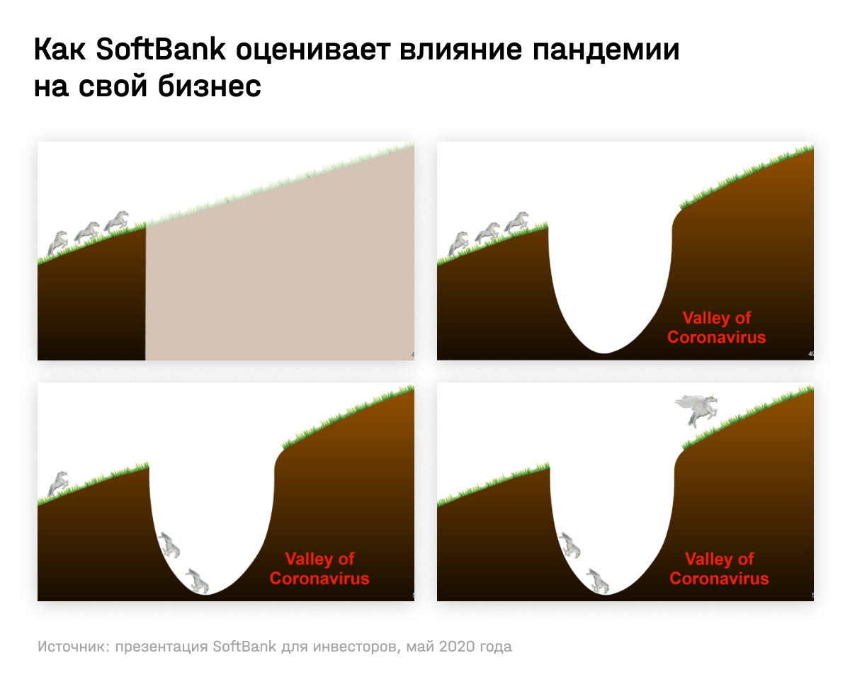 В следующей презентации инвесторам в мае 2020 года, разбор которой я делал в статье «Единорог не полетел: второй мастер-класс презентации от SoftBank», Сон сконцентрировался, помимо стандартных слайдов по динамике стоимости портфеля, на том, почему же компании из портфеля SoftBank находятся в кризисе. Вся презентация — здесь.