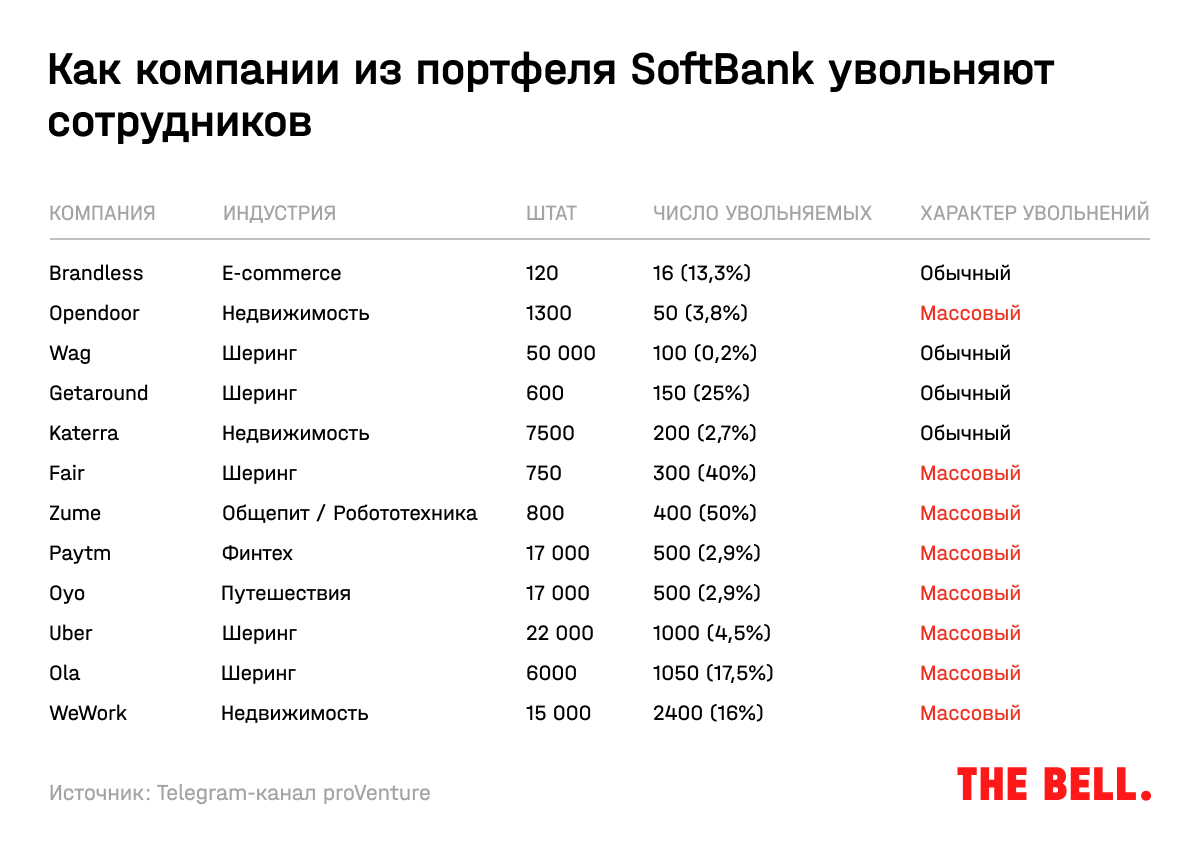 В этом есть логика. Не только WeWork испытывает трудности. Убытки от OneWeb (который подал на банкротство) и WeWork составили $24 млрд, значительные сокращения также прошли по всему портфелю SoftBank. Доля в Wag была продана с большим убытком. Zume Pizza, Oyo, Getaround и другие массово сокращали сотрудников.