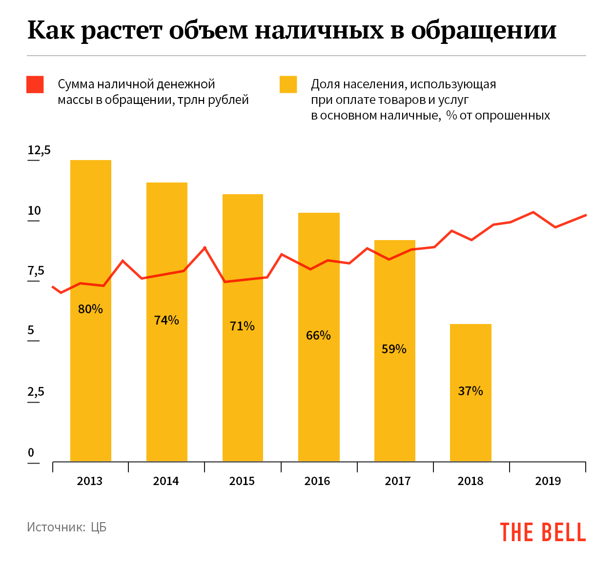 Но на обороте наличных в стране все эти мероприятия практически не сказались. И это при том, что с 2014 года доля россиян, которые в основном пользуются наличными, сократилась вдвое. Рынок грязных финансовых услуг так и не уменьшился. Просто они сильно подорожали. Если в начале 2010-х за обнал просили 2–3%, то сейчас — 15–20%.