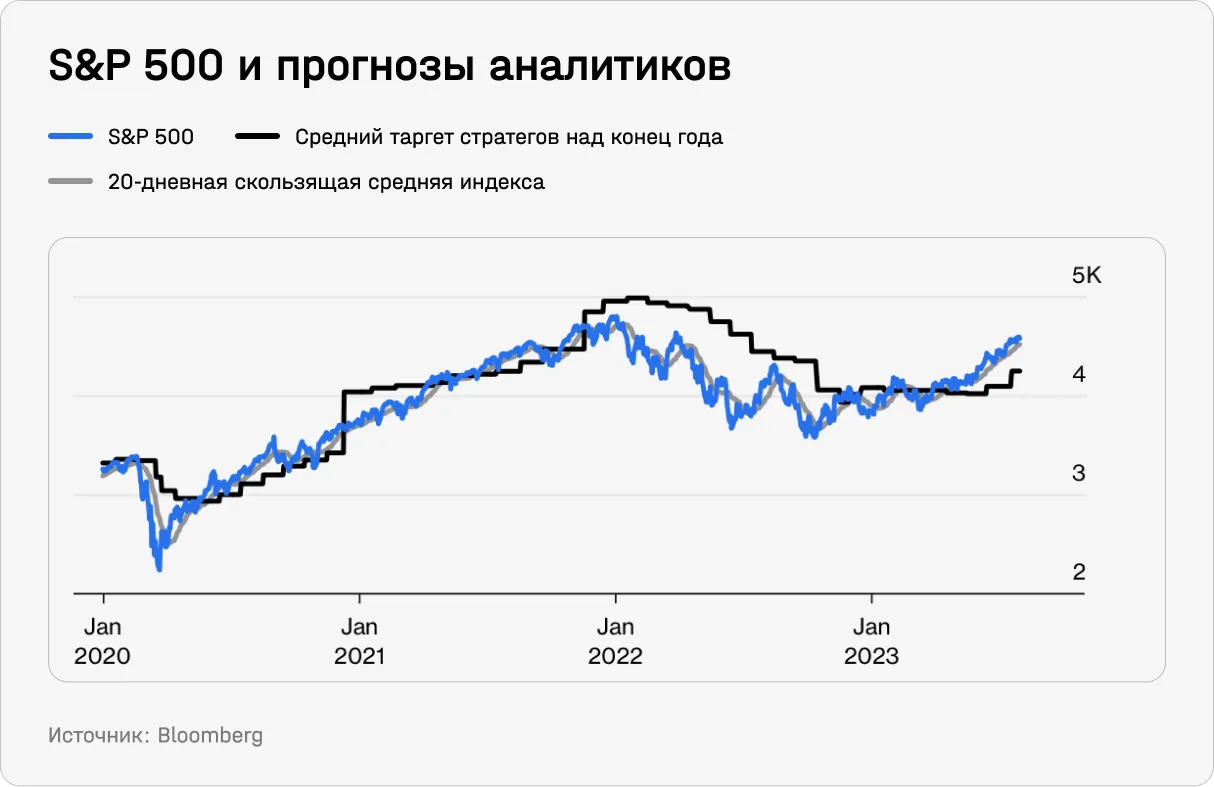 На сентимент, в свою очередь, влияют макрофакторы, которые трудно предсказывать, отмечает Николас Колас из DataTrek Research. Среди факторов, приведших к ошибке в прогнозе, Уилсон указал на хайп вокруг ИИ и увеличение баланса ФРС после краха нескольких региональных банков в марте — предсказать эти события было невозможно. Например, хоть крах банков и был логичным следствием роста ставок (подробнее о причинах мы рассказывали здесь), но стоило ожидать того, что в результате финансовые условия ужесточатся, а не наоборот.