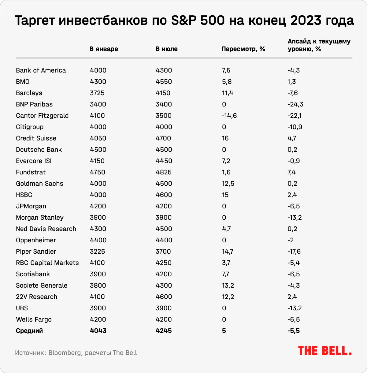 В результате многие стратеги — даже главные «медведи» вроде Майка Уилсона из Morgan Stanley, который прямо признал ошибку в прогнозе на этот год, — в июле были вынуждены капитулировать и увеличить таргеты по S&P 500 на конец года.