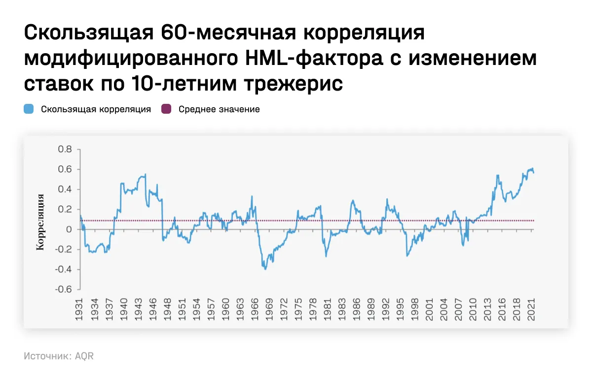 Но, как выяснилось, такая связь прослеживалась не всегда: начиная с 1926 года коэффициент корреляции между модифицированной HML и ставками сильно колебался, при этом в среднем он составлял только 0,1, подсчитал Эснесс. Он решил проверить, насколько фактор стоимости/роста в реальности связан с изменением ставок. Несколько недель назад Эснесс опубликовал результаты соответствующего исследования.