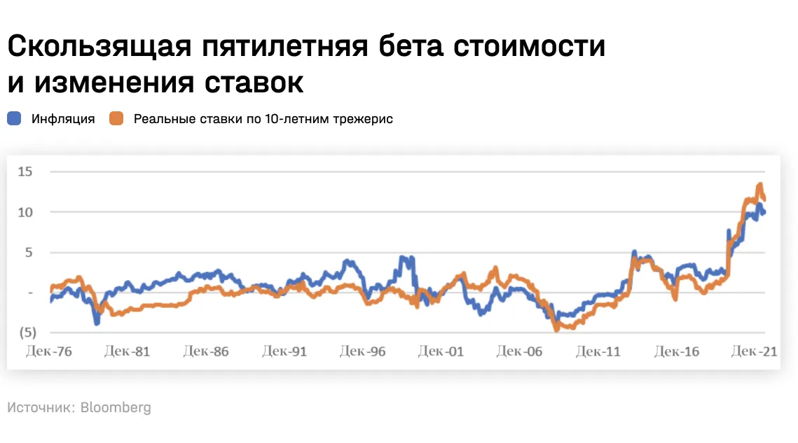 Текущий коэффициент бета, составляющий примерно 10, означает, что увеличение инфляции или реальной доходности 10-летних казначейских облигаций на 50 б. п. приводит к опережающему росту акций стоимости по сравнению с акциями роста на 5 п. п.
