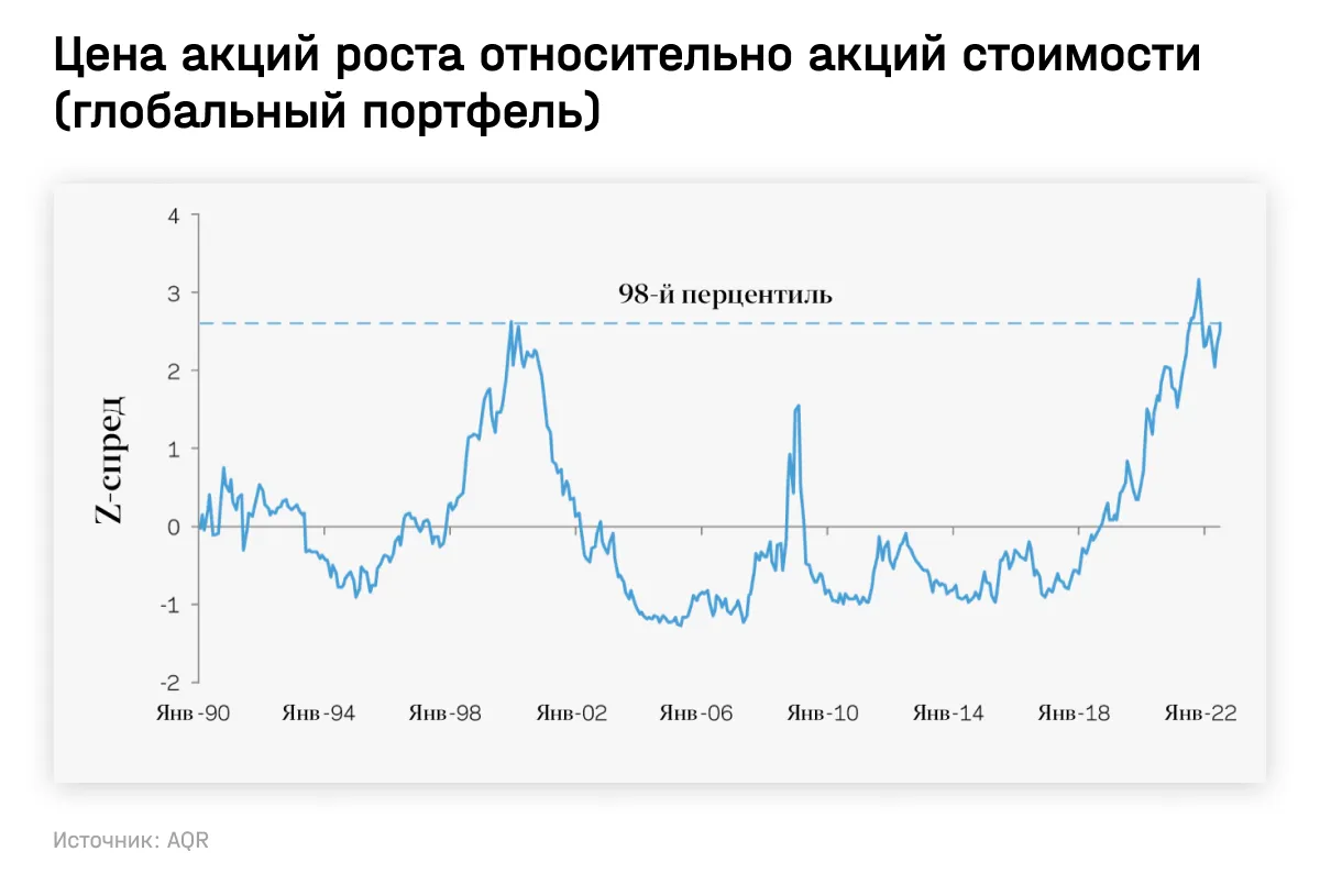 Предсказать, куда пойдет рынок в ближайший месяц или год, — невозможно. Но есть интересный факт: акции роста все еще выглядят крайне дорогими относительно акций стоимости. Такой оптимизм по поводу быстрорастущих компаний может основываться на неверных теоретических предпосылках, которые могли стать одной из причин надувания нынешнего пузыря.