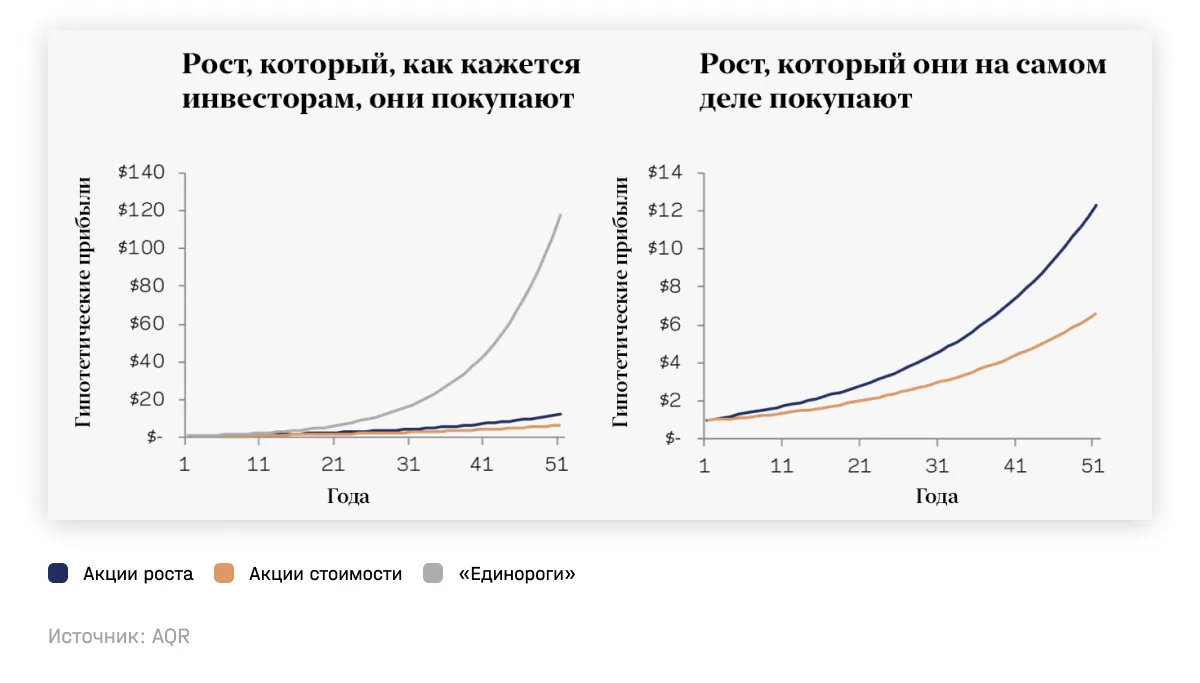 Покупая акции роста, инвесторы надеются найти «новый Amazon» и держать его много лет. Но найти такого «единорога» среди всех акций и сделать правильную ставку крайне сложно, поэтому инвестиции в акции роста в среднем приносят меньшую доходность, чем надеются инвесторы.