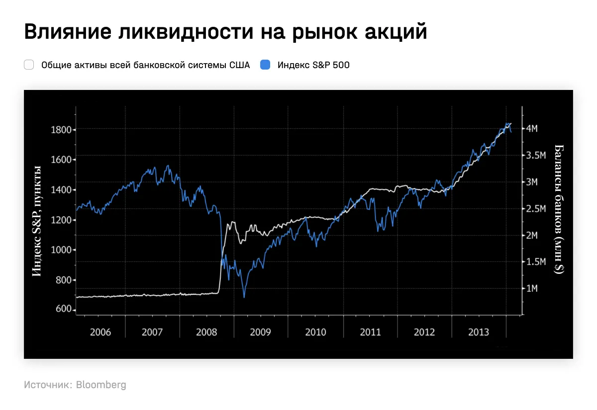 В 2008 году Бернанке предпринял все возможное, чтобы не дать разориться крупным банкам. Начатая им программа количественного смягчения привела к мощнейшему и продолжительному ралли в американских акциях. В следующие годы ликвидность, которую предоставляла ФРС, была одним из главных драйверов роста акций.