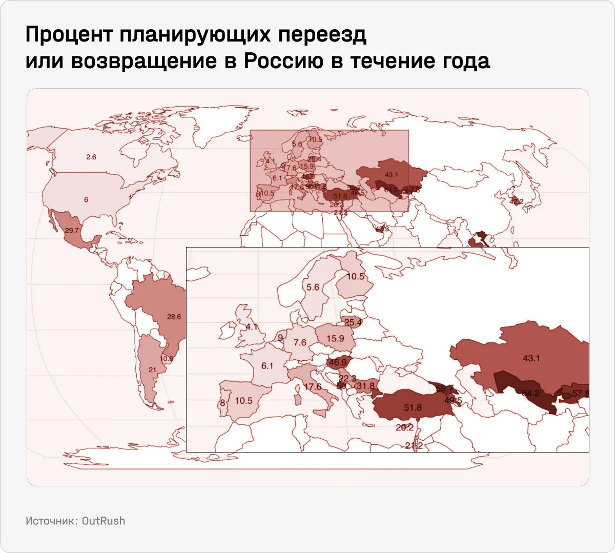 Точного числа вернувшихся в Россию из тех, кто уехал в 2022-м, — нет, но результаты исследования OutRush могут как минимум свидетельствовать о том, что в этот период процесс уже не носил массовый характер.