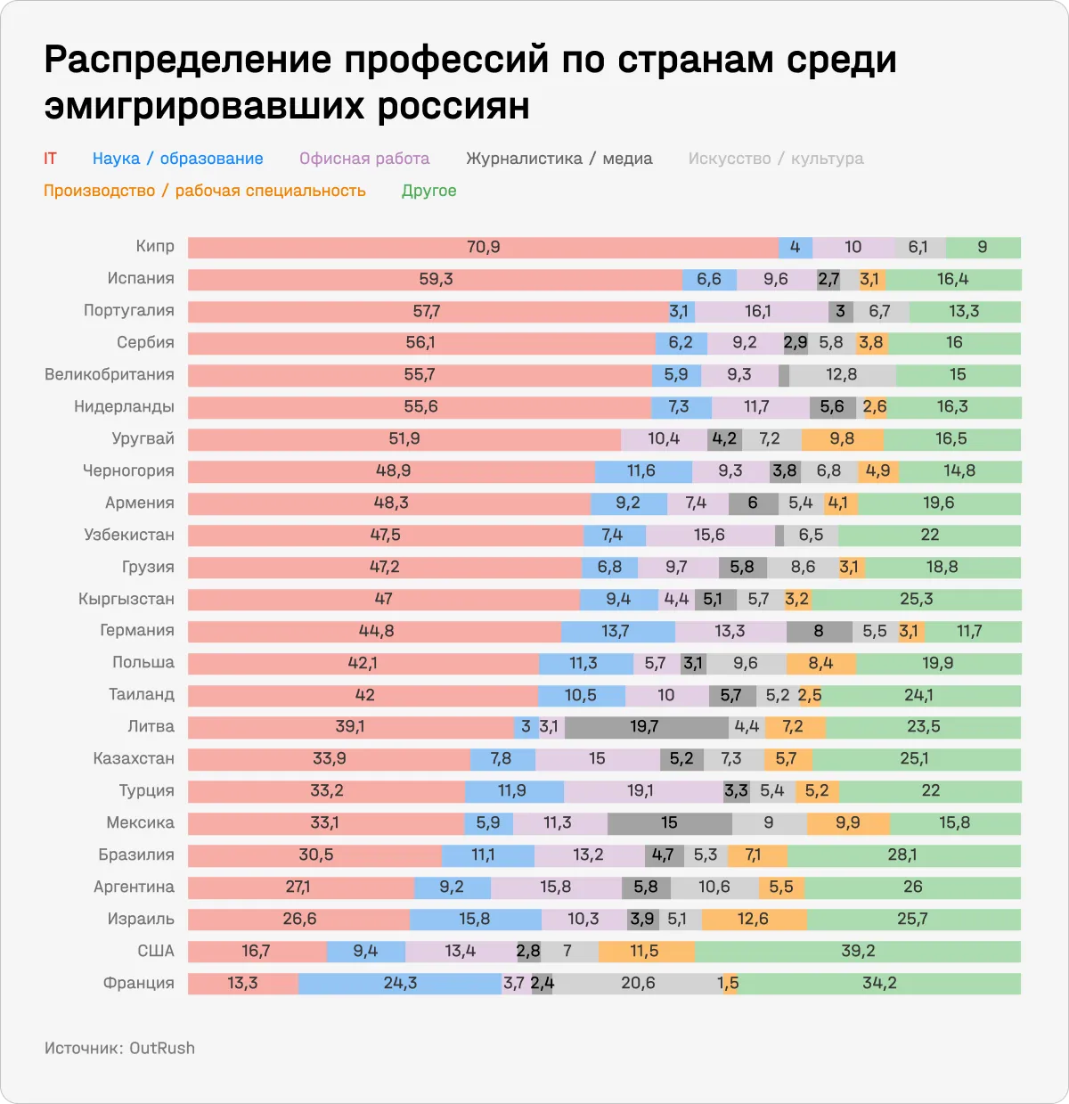 Больше всего российских айтишников привлекли страны Европы и Европейского союза, говорится в исследовании. Самая высокая доля эмигрантов из этой профессии (71%) оказалась на Кипре — про «остров айтишников» Елизавета Осетинская (признана иноагентом) даже сняла целый фильм. Также большое число российских айтишников осело в Испании (59%), Португалии (58%), Сербии, Нидерландах и Великобритании (по 56%), Уругвае (52%), Черногории (49%) и Армении (48%).