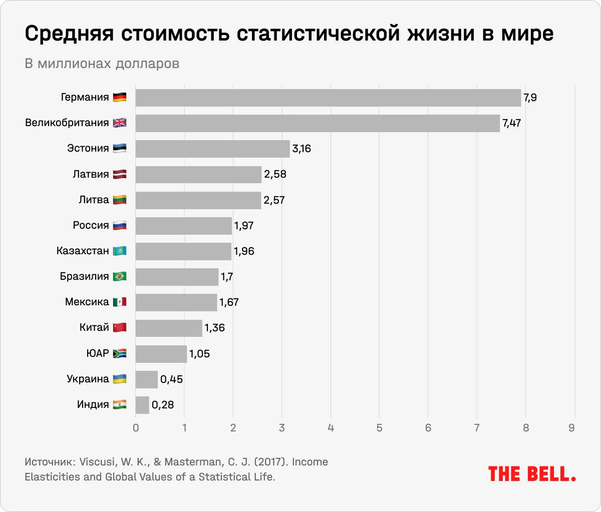 Среди тех, кто так считает, — Кип Вискузи из Вандербильтского университета в США, один из главных мировых экспертов по теме ССЖ. В одной из своих работ он использовал специальный метод для оценки стоимости жизни в странах, где отсутствовала необходимая для проведения расчетов статистика. Взяв за основу стоимость жизни в США ($9,6 млн в ценах 2015 года), он рассчитал ССЖ для других стран, скорректировав его значение на разницу в доходах. Получилось, что среднестатистическая стоимость жизни в России составляет $1,97 млн — почти в пять раз ниже, чем в США, в четыре раза ниже, чем в Германии, и чуть выше, чем в Казахстане, Мексике и Китае. В рублях на момент проведения исследования это было около 120 млн рублей, сейчас — около 175 млн рублей.