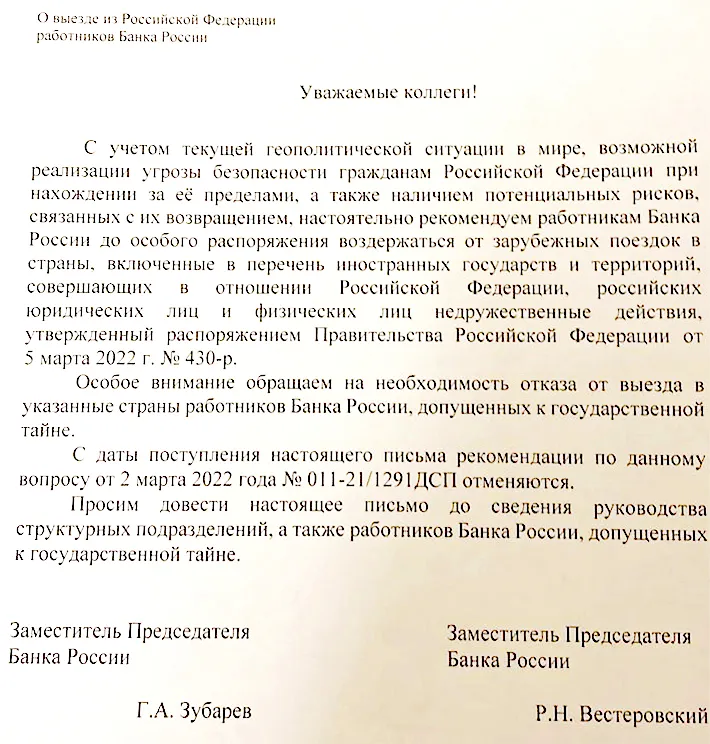 Письмо обращено к зампредам ЦБ, членам совета директоров, руководителям структурных подразделений центрального аппарата, территориальных учреждений и других подразделений Банка России. Оно подписано зампредами Германом Зубаревым и Русланом Вестеровским.