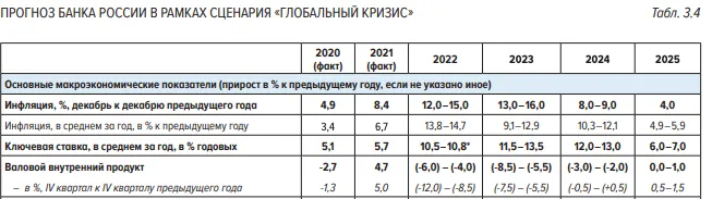 Инфляция в случае глобального кризиса в 2023 году вырастет до 13–16%. Как следствие — ЦБ существенно повысит ключевую ставку по сравнению с базовым сценарием и будет поддерживать ее на повышенном уровне.