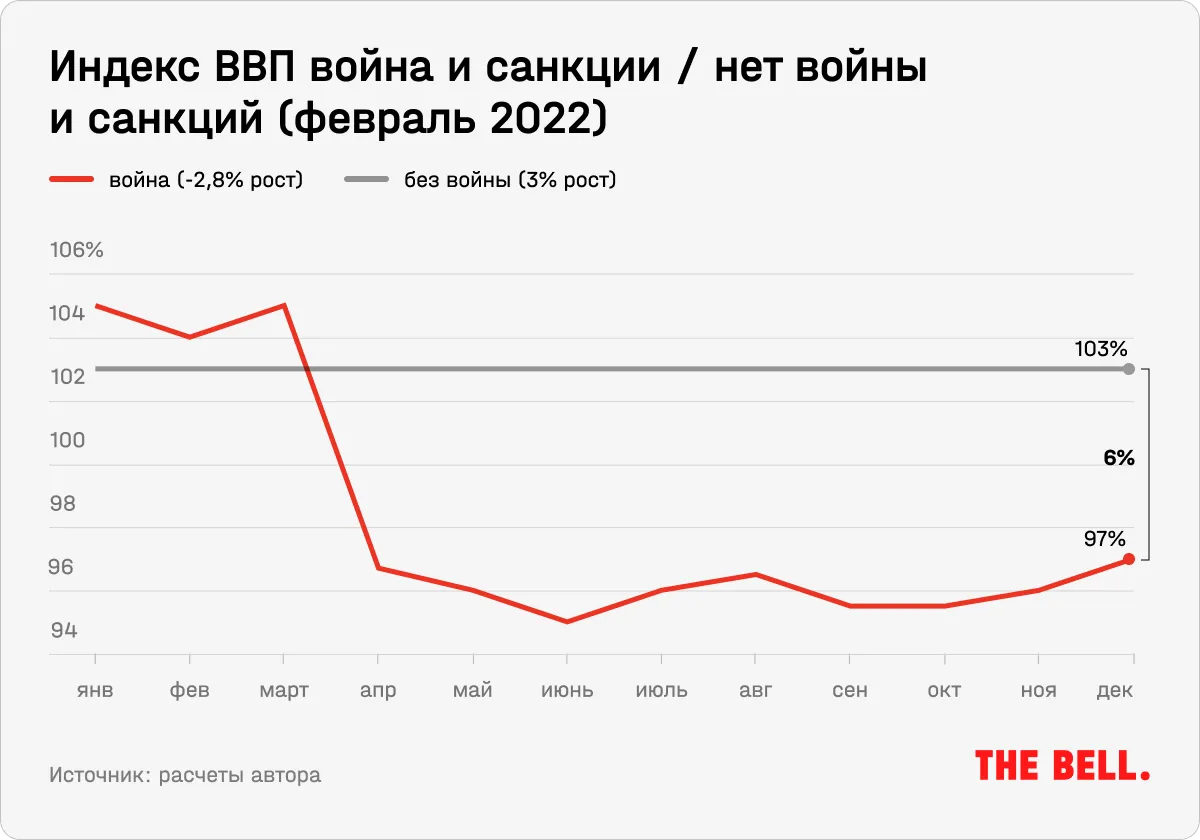 Российская экономика в 2022 году должна была увеличиться примерно на 3% ВВП, прогнозировали еще в начале февраля правительство, ЦБ и экономисты. Но 24 февраля Владимир Путин принял решение начать вторжение в Украину. В ответ на российскую агрессию широкая коалиция западных и восточных стран ввела против России несколько пакетов санкций. В результате спад в 2022 году составит примерно 2,8% ВВП. А в общей сложности российская экономика в этом году недосчитается примерно 6%.