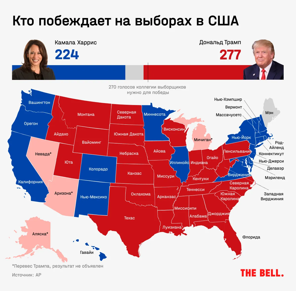 Перед этим счетчики ведущих американских СМИ надолго замерли на 267 голосов выборщиков у Трампа. На этой отметке за ним были три колеблющихся штата, два из которых — ключевые Пенсильванию и Джорджию — он отбил у демократов. Отдать ему еще один — причем любой — означало сразу же признать проигрыш Харрис.