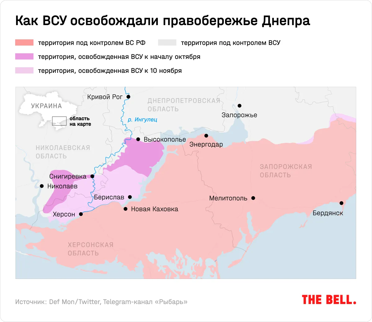 Украинские войска постепенно занимают оставленные ВС РФ территории на правом берегу. Владимир Зеленский в вечернем обращении объявил, что украинские силы специальных операций уже вошли в Херсон, а The Washington Post сообщила, что ВСУ уже взяли под контроль три района города и вышли к берегу Днепра. Украинские СМИ утверждают, что ВСУ вошли и в стратегически важный Берислав, находящийся по другую сторону Днепра от подконтрольной России Каховской ГЭС.