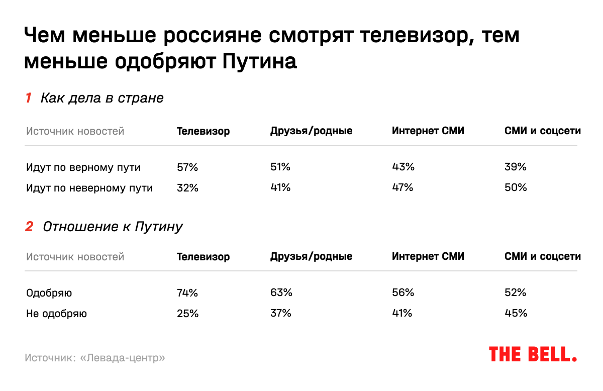 Уровень одобрения деятельности Путина и убежденности, что дела в стране идут в верном направлении, коррелируют с тем, откуда люди получают информации. Как можно догадаться, те, кто узнает новости из телевизора, доверяют президенту больше. Те, кто читает интернет-СМИ и интернет, — наоборот. В том, что дела в стране идут в верном направлении, уверены 57% из тех, кто смотрит телевизор, и только 39% из тех, кто читает онлайн-СМИ и соцсети. Одобряют Путина 74% и 52% соответственно.