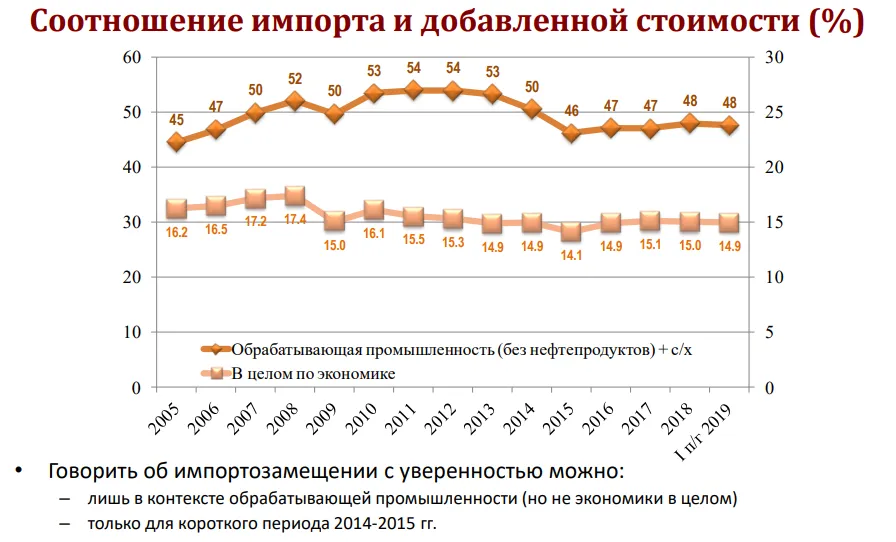 В последний раз ЦМАКП публиковал всеобъемлющую оценку эффективности импортозамещения к пятилетию провозглашения этой политики — в 2019 году. В части импортозамещения прогресс в последние годы практически отсутствует, заключал тогда в своем итоговом докладе Сальников: говорить об импортозамещении с уверенностью можно лишь в контексте обрабатывающей промышленности (но не экономики в целом) и лишь для короткого периода 2014–2015 года. В доказательство он приводил график, из которого следовало, что с 2015 по 2019 годы соотношение импорта и добавленной стоимости практически не менялось: