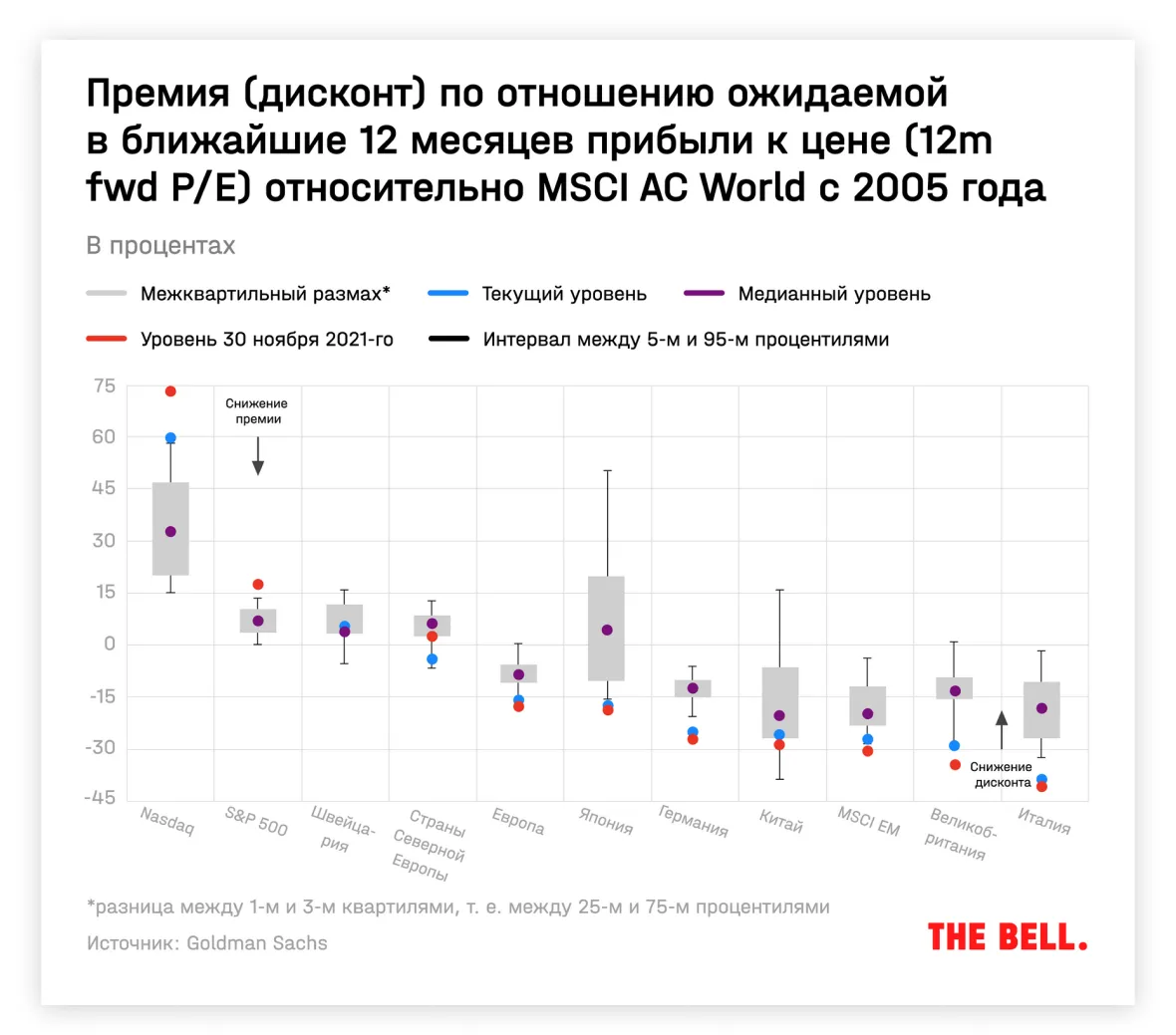 Европейский рынок в целом выглядит дешево по сравнению с американским. Даже после январской коррекции Nasdaq спред между «ростом» и «стоимостью» выглядит большим, говорится в вышедшем в среду отчете Goldman Sachs (есть у The Bell).