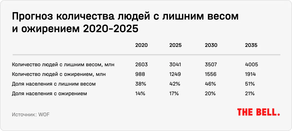 По оценке Morgan Stanley (MS), объем мирового рынка лекарств от ожирения в 2022 году составил $2,4 млрд, а к 2030 году он может достигнуть $54 млрд. Это предполагает рост с впечатляющим совокупным годовым темпом 48%.